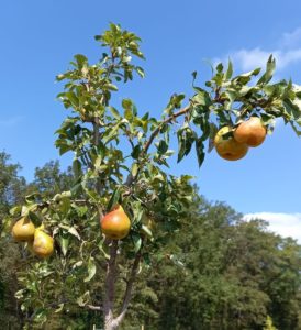 Nous y comptons quatre variétés locales de poiriers, pommiers, mirabelles et pruneaux.